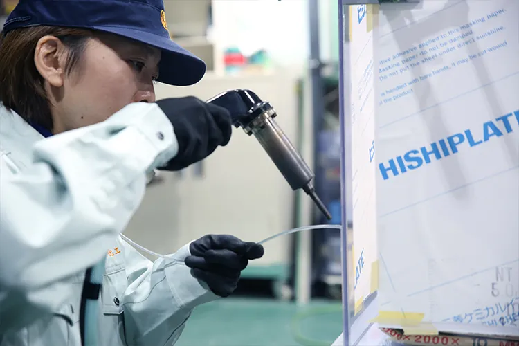 具体的には材料(PPやPVC等)を図面の寸法通りに切り取り、専用の機械(マシニング等)で穴あけなどの加工を行います。